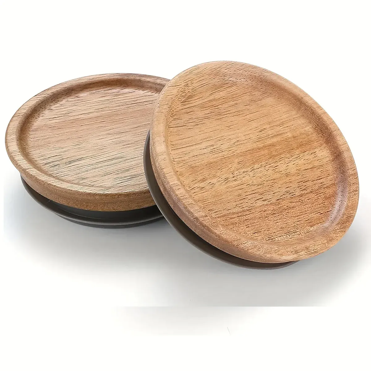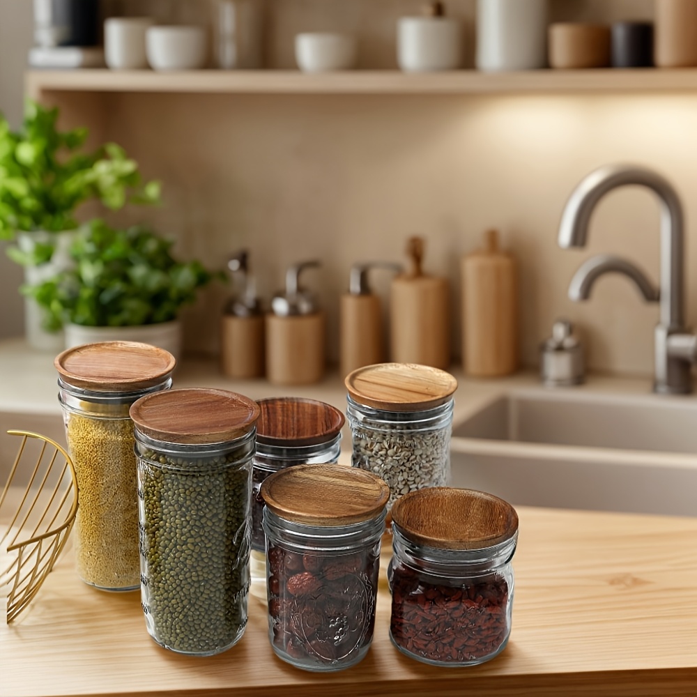 This set includes wooden storage lids designed to cover regular mouth jars for dry storage and organization. The lids are intended to create a closed top surface when placed on compatible jar openings. A reusable construction supports repeated use and routine cleaning. Use with regular mouth jar rims for a simple, low-profile cover option.