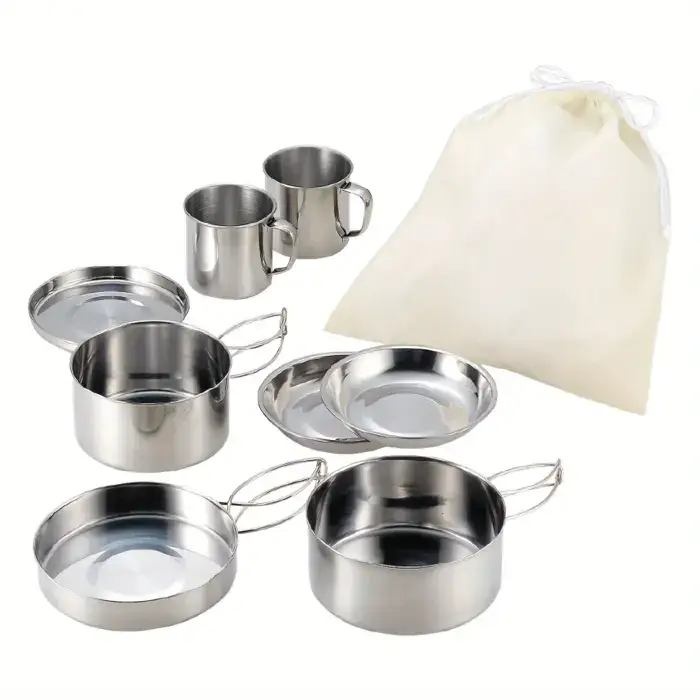 8-Piece Stainless Steel Camping Cookware System for Outdoor Cooking & Boiling